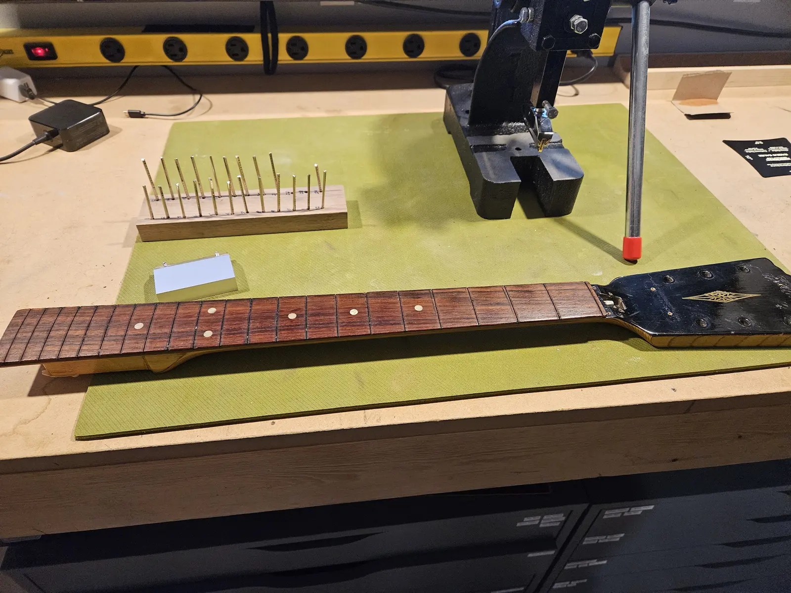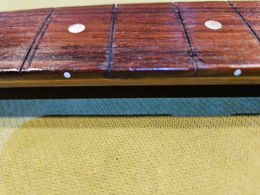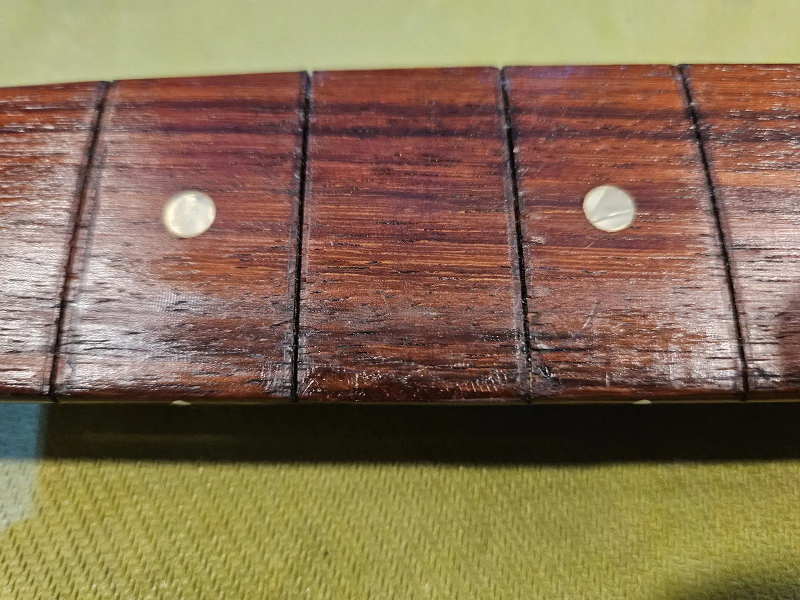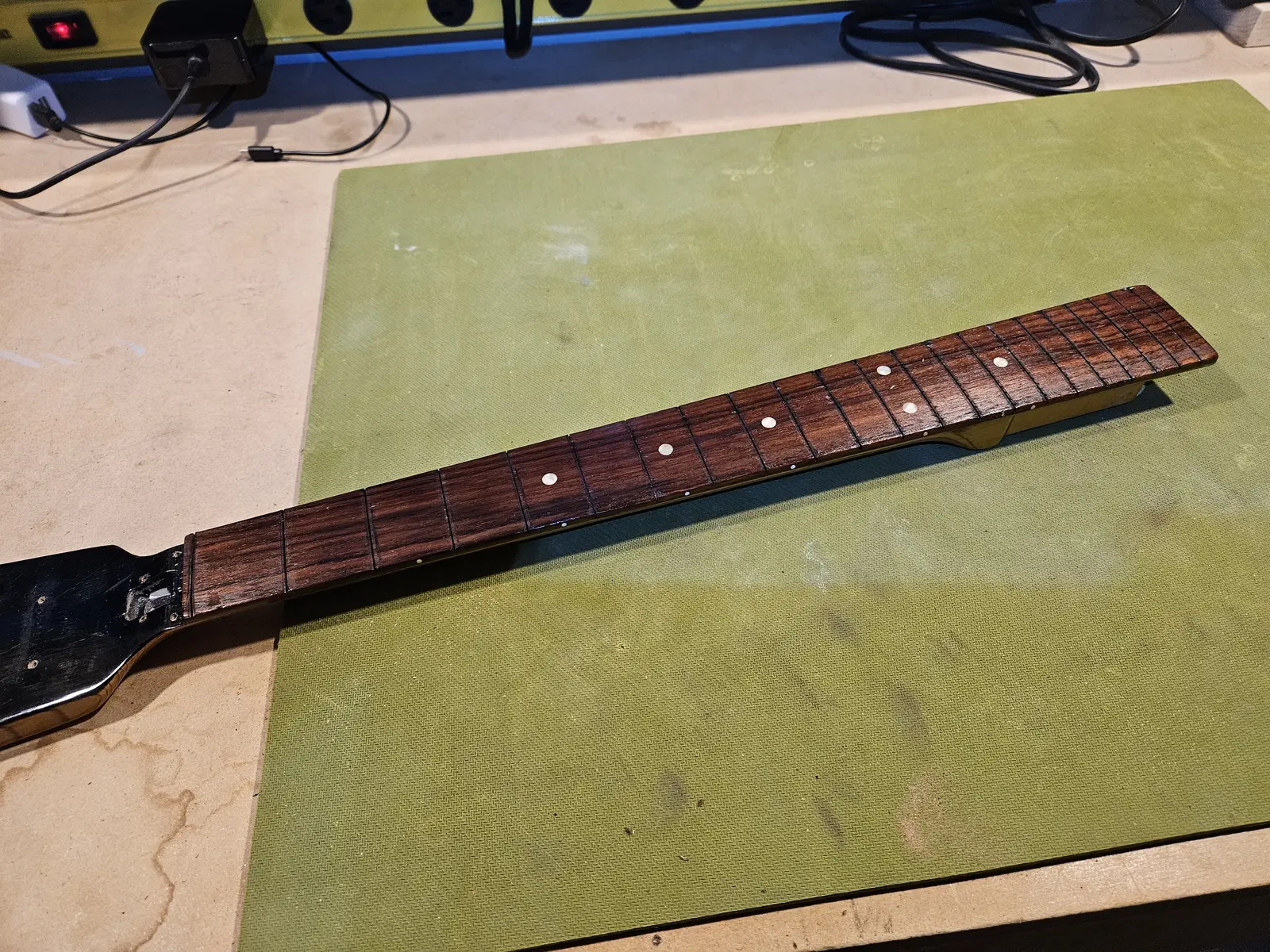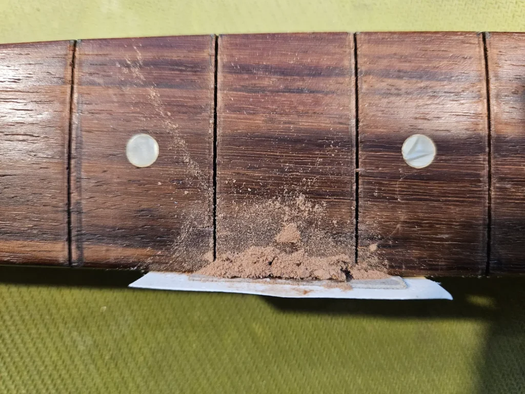 I started by cleaning out the site to get down to fresh wood, then built the area back up using a mix of rosewood dust and CA glue. Once that had plenty of time to cure, I took a file to it and sanded it back to match the original neck profile. It’s leveled and blended now so the repair is flush with the rest of the board.
